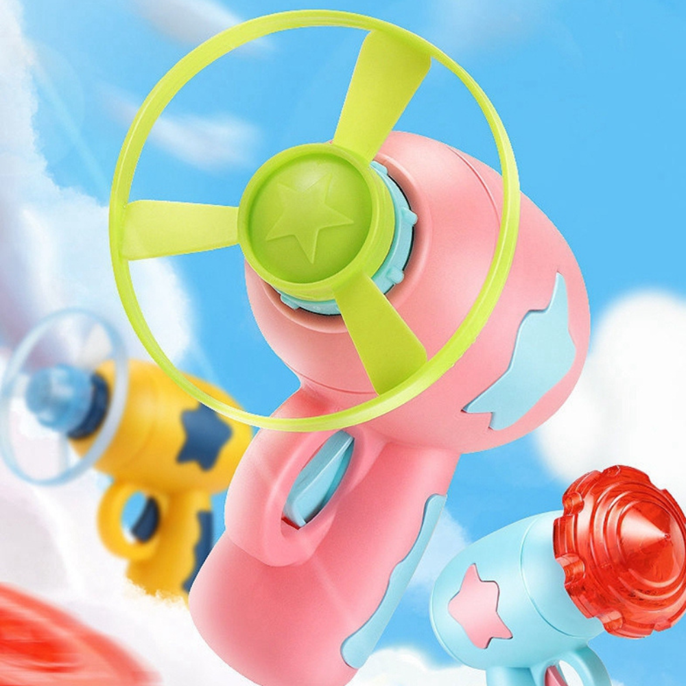 Basta encaixar um dos 4 discos disponíveis no brinquedo e girar algumas vezes para tracionar, e apertar o gatilho para soltar. Não é um brinquedo elétrico, não precisa de pilhas, baterias e nem carregadores.